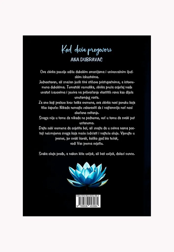 Ana Dubravac nació el 27 de enero de 1992 en Osijek. Se presentó al público por primera vez a comienzos de 2025 con su colección de poesía Cuando el alma habla. Aunque se dedica principalmente a la poesía, Ana también escribe prosa y cuentos, y actualmente está laburando en un montón de proyectos literarios futuros.